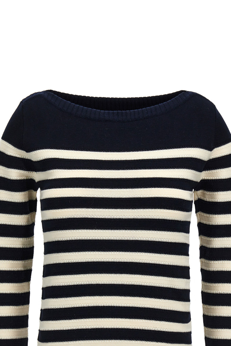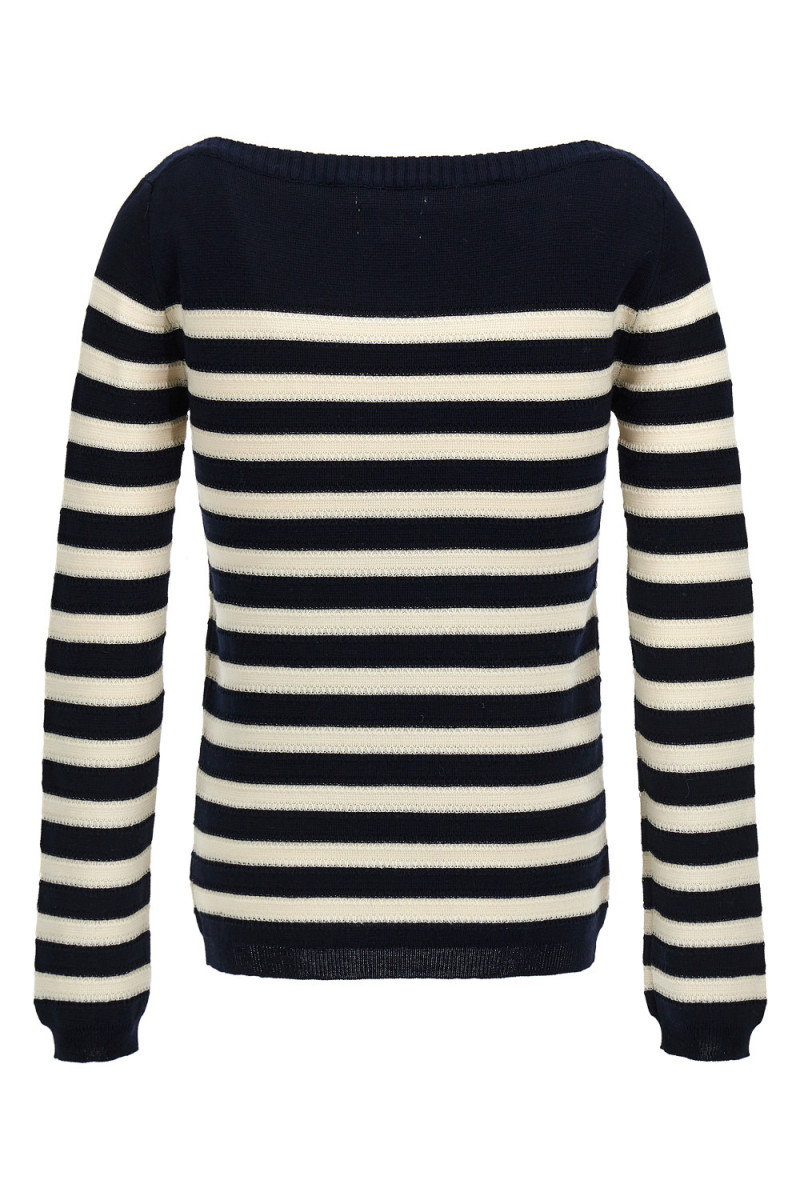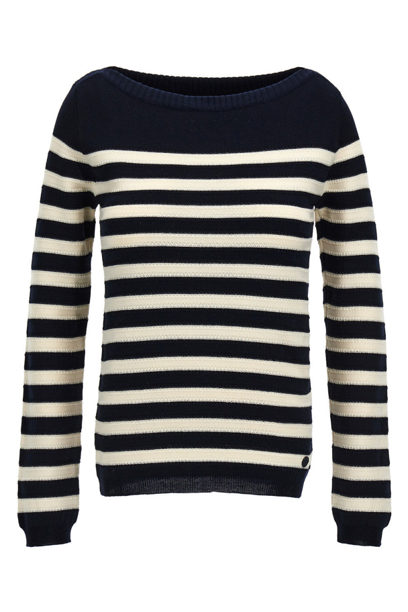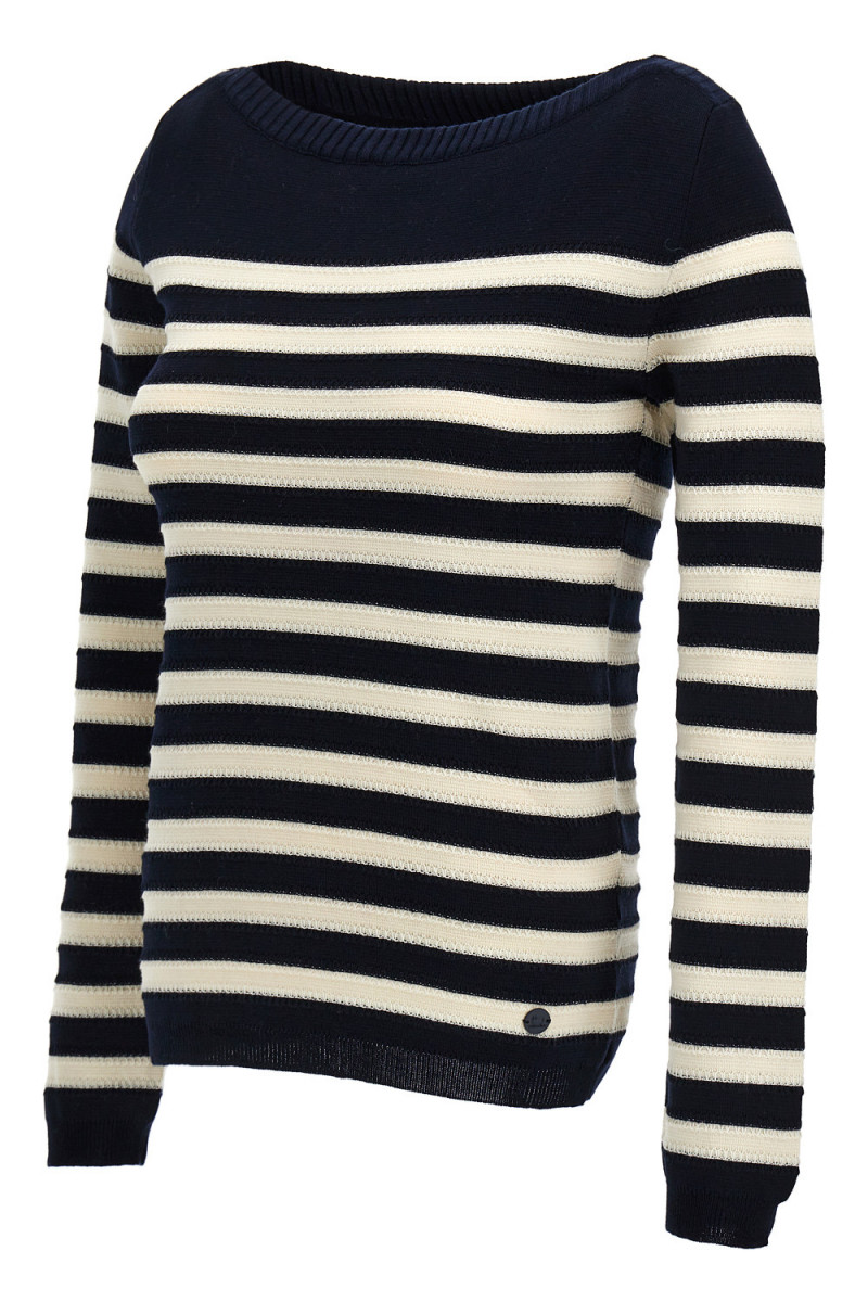 Szűk szabású női pulóver, amely előnyösen mutat a női sziluetten és elegáns, kifinomult nyakkivágással van ellátva. A szegély felett minimalista márkajelzéssel, amely remekül mutat a puha kötött anyagon található időtálló tengerész mintával. A 100%-ban természetes, prémium minőségű pamutszálból készült anyag tökéletes légáteresztő képességet és rendkívül kényelmes érzést garantál viselés közben. Előnyös alapdarabja a lezser, ugyanakkor elegáns öltözéknek, amelybe garantáltan beleszeret majd.