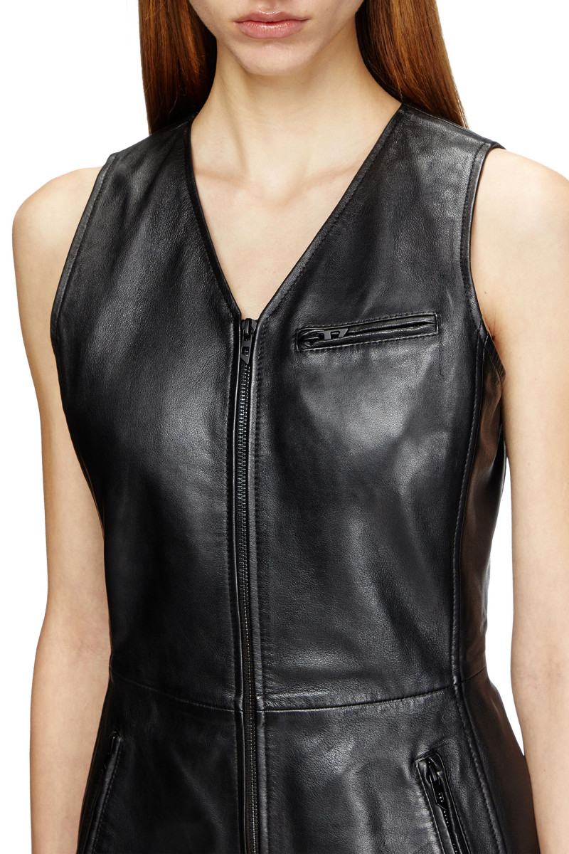 V-nyakkivágással ellátott, ujj nélküli női miniruha. A szűk szabású darabot praktikus cipzáras zsebek és díszes szegélyek egészítik ki. Kiváló minőségű báránybőrből készült, így kellemes tapintású és tartós. A jellegzetes V-nyakkivágással és kétirányú cipzáras záródással ellátott darab vonzó, ugyanakkor azonban praktikus. A ruha tökéletes választás olyan esti eseményekre, ahol ki akar majd tűnni a tömegből jellegzetes és elegáns stílusával. A modell 40-es méretet visel és 175 cm magas.