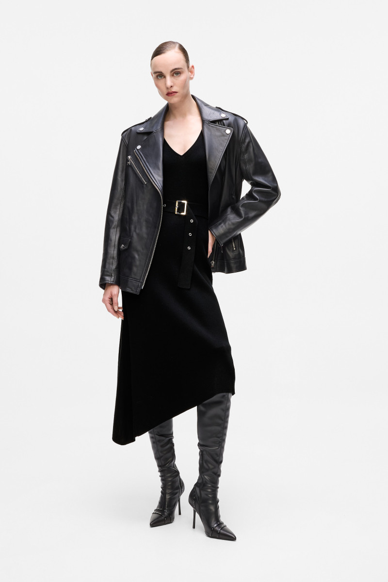 Kötött női ruha karcsúsított szabással, mély V-nyakkivágással és aszimmetrikus térd alá érő szoknyával. Egyszínű dizájnja elegáns övvel van díszítve a derekán, ezüst csattal. A sofisztikáltan textúrázott kötött anyag minőségi viszkózszálból készült, amely jellemzően fényes, puha és kellemesen lágy. A prémium anyagokból készült minőségi kivitelezés garantálja a kényelmes viseletet viselés közben. Tökéletesen illeszkedő, vagányan néz ki, laza-elegáns darab.