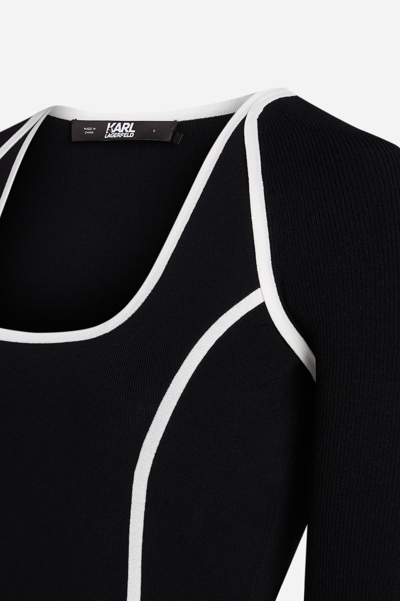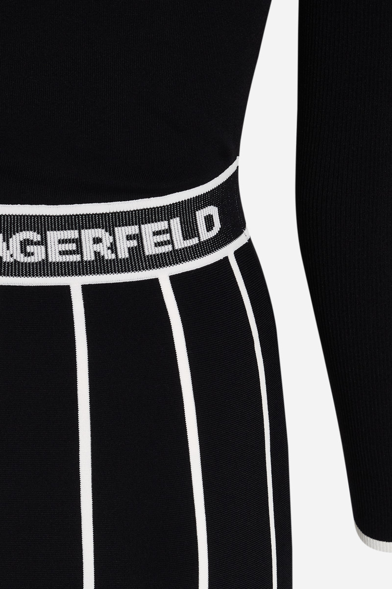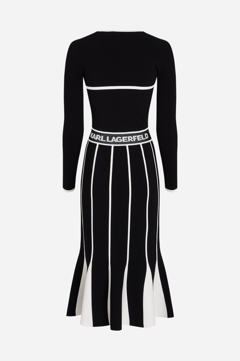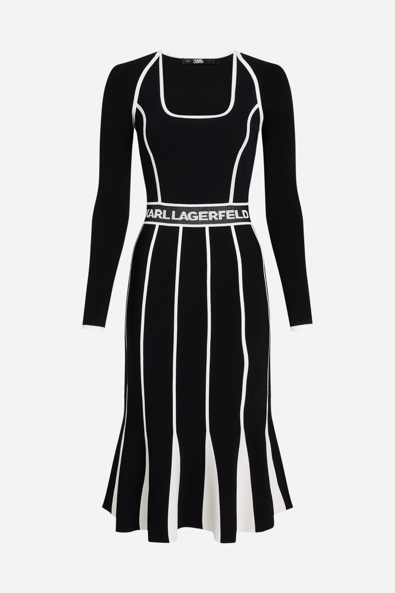 Kötött női ruha, amely térd alatti hosszúságú. A testhezálló sziluettű darabot szélesebb szoknya és lecsatolható, hosszú ujjú boleró egészíti ki, amelynek köszönhetően a ruha más dimenzióba röpíti majd. A kontrasztos csíkozás kifinomulttá varázsolja és a derékrészen található Karl Lagerfeld logó kihangsúlyozza viselője alakját. Anyaga tökéletes áramlást, könnyedséget és maximális viselési kényelmet garantál. Nőies, rendkívül kifinomult darab, amely stílusosan felfrissíti majd ruhatárát.