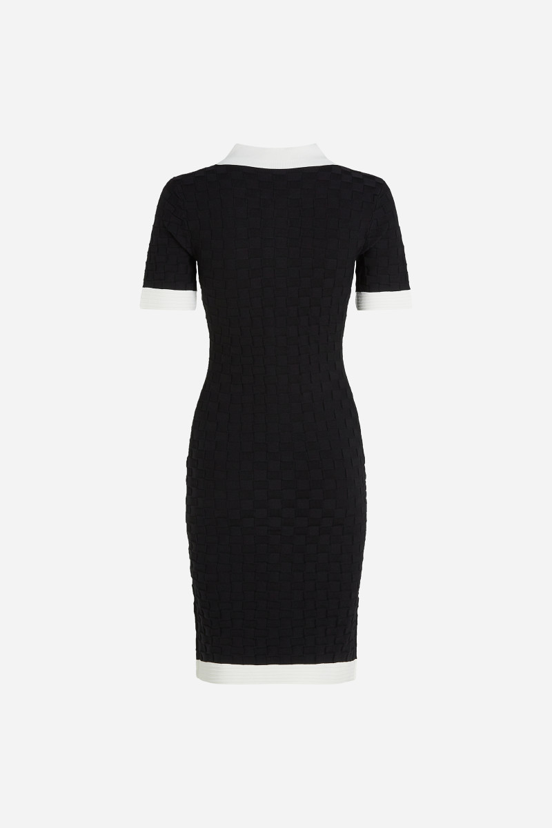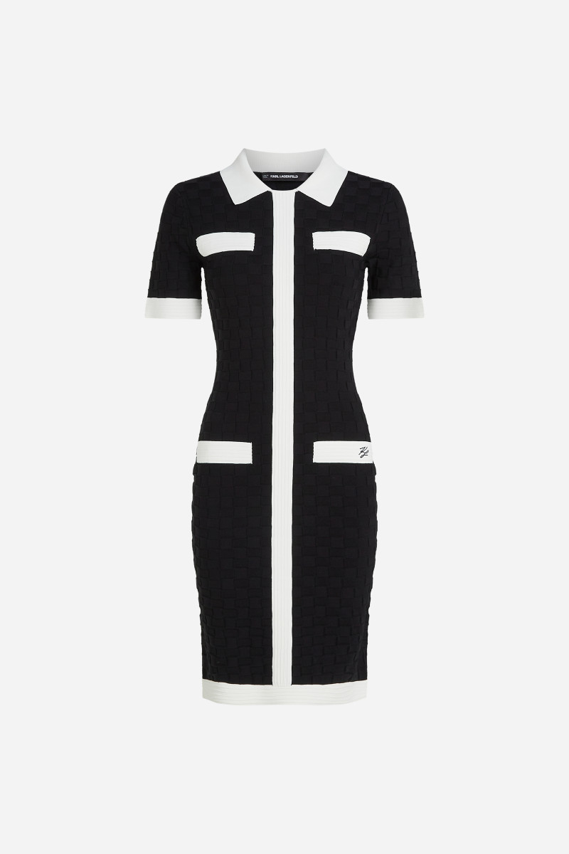 Női kötött ruha rövid ujjakkal és térd fölötti hosszal. A testet körülölelő sziluettet kontrasztos gallér egészíti ki, továbbá kontrasztos szegélyezés és a Karl Autograph hímzett logó díszíti. A könnyű és gyönyörűen omló anyagösszetétel, amely újrahasznosított viszkózkeverékből készült, garantálja a rendkívül kényelmes viseletet. A ruha nagyon kellemes tapintású és rendkívül kényelmes viselése. Egy összetéveszthetetlenül stílusos darab, amely korlátlan stílusolási lehetőségeket kínál.