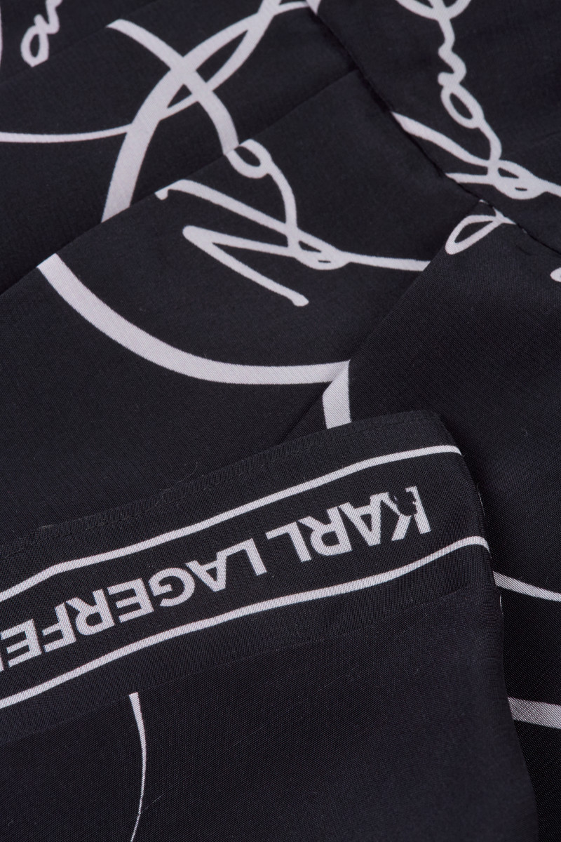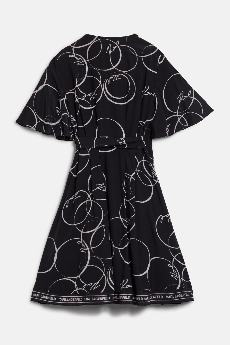 Rövid ujjú, V-nyakkivágással ellátott, átlapolt női ruha. Az elegáns darabot teljes egészében Karl Signature minta díszíti. Övvel ellátott, amelynek köszönhetően tökéletes alakot kölcsönöz viselőjének. Az elegáns, áramló anyag egyedi, viszkózszál kombinációból készült, amely kellemes puhaságával, légáteresztő képességével és viselési kényelmével elvarázsolja majd. Egy rendkívül előnyös darab, amely időtálló szabású és sportos, ugyanakkor elegáns vagy formális öltözékének elengedhetetlen részévé válik.