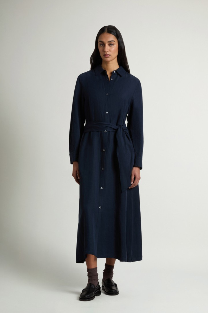 Női ingruhás ruha midi hosszúságban, térd alá érővel. Egyszínű kialakítás gallérral, gombokkal a záródásnál és hosszú ujjal, amit gombos mandzsettával egészítenek ki, valamint tonális övvel a derékrészén. A viszkóz és len keverékéből készült minőségi szövet garantálja a tökéletes légáteresztést és könnyedséget. Nőies, rendkívül elegáns darab, amely feldobja a megjelenésedet.