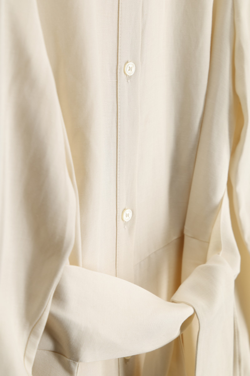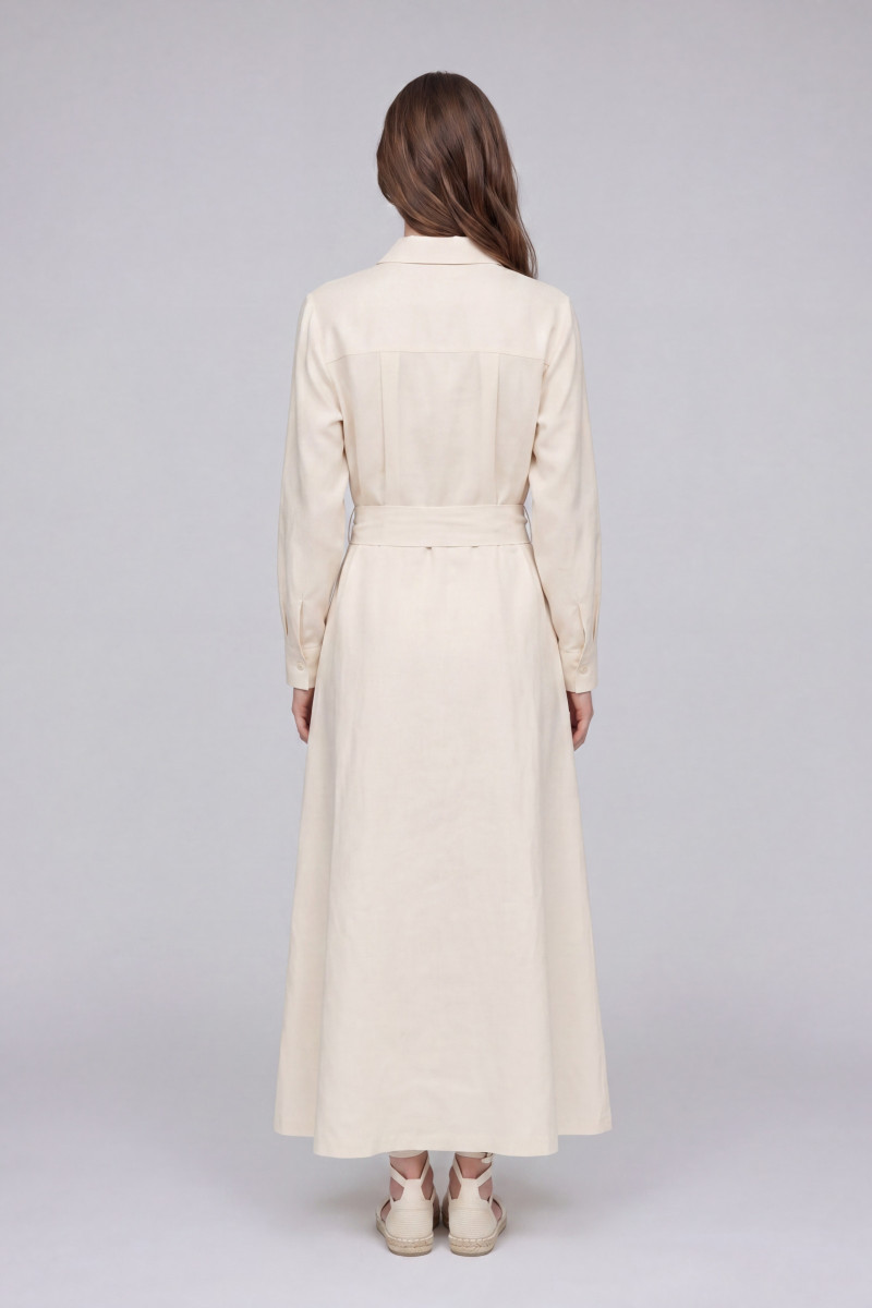 Női ingruhás ruha midi hosszúságban, térd alá érővel. Egyszínű kialakítás gallérral, gombokkal a záródásnál és hosszú ujjal, amit gombos mandzsettával egészítenek ki, valamint tonális övvel a derékrészén. A viszkóz és len keverékéből készült minőségi szövet garantálja a tökéletes légáteresztést és könnyedséget. Nőies, rendkívül elegáns darab, amely feldobja a megjelenésedet.
