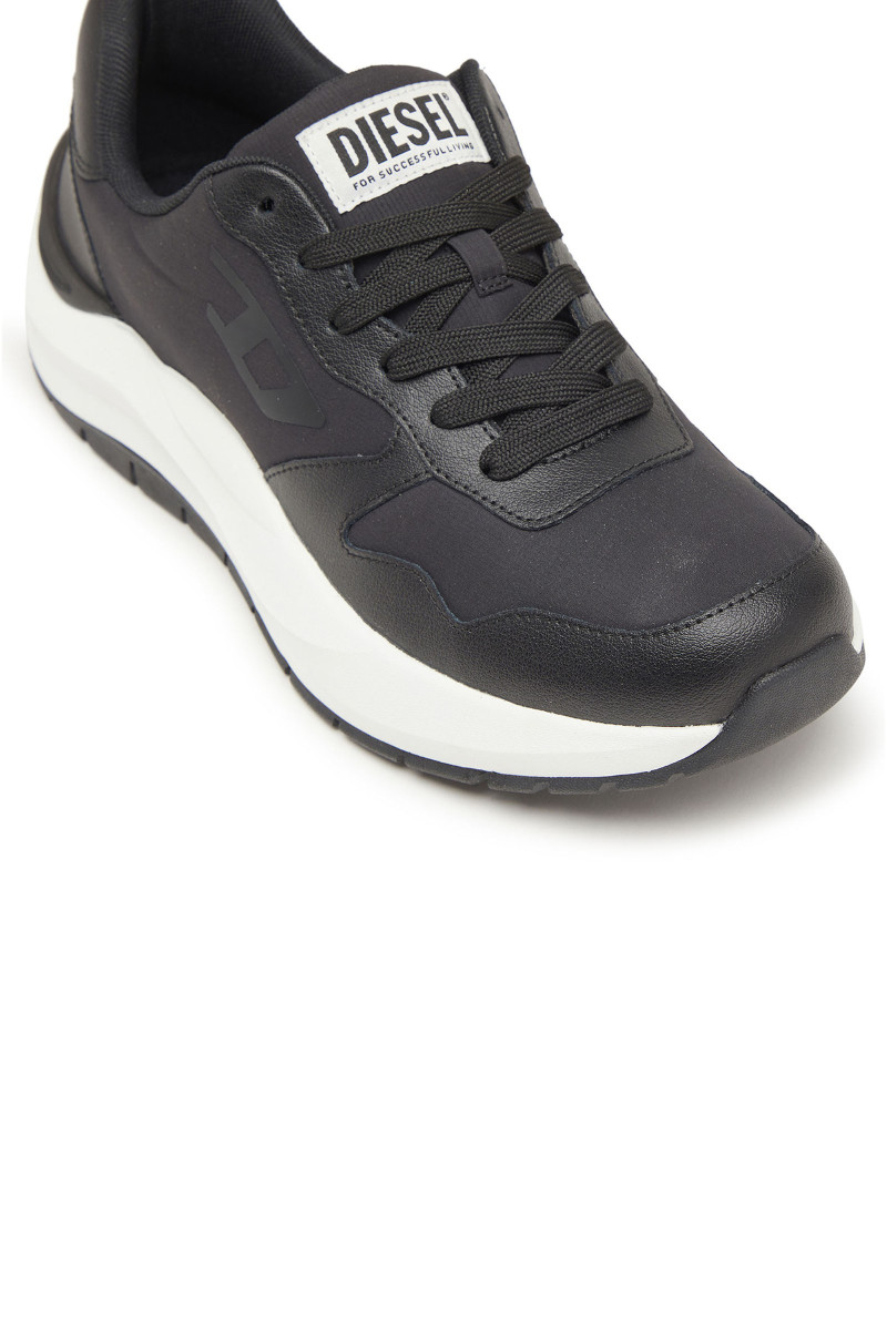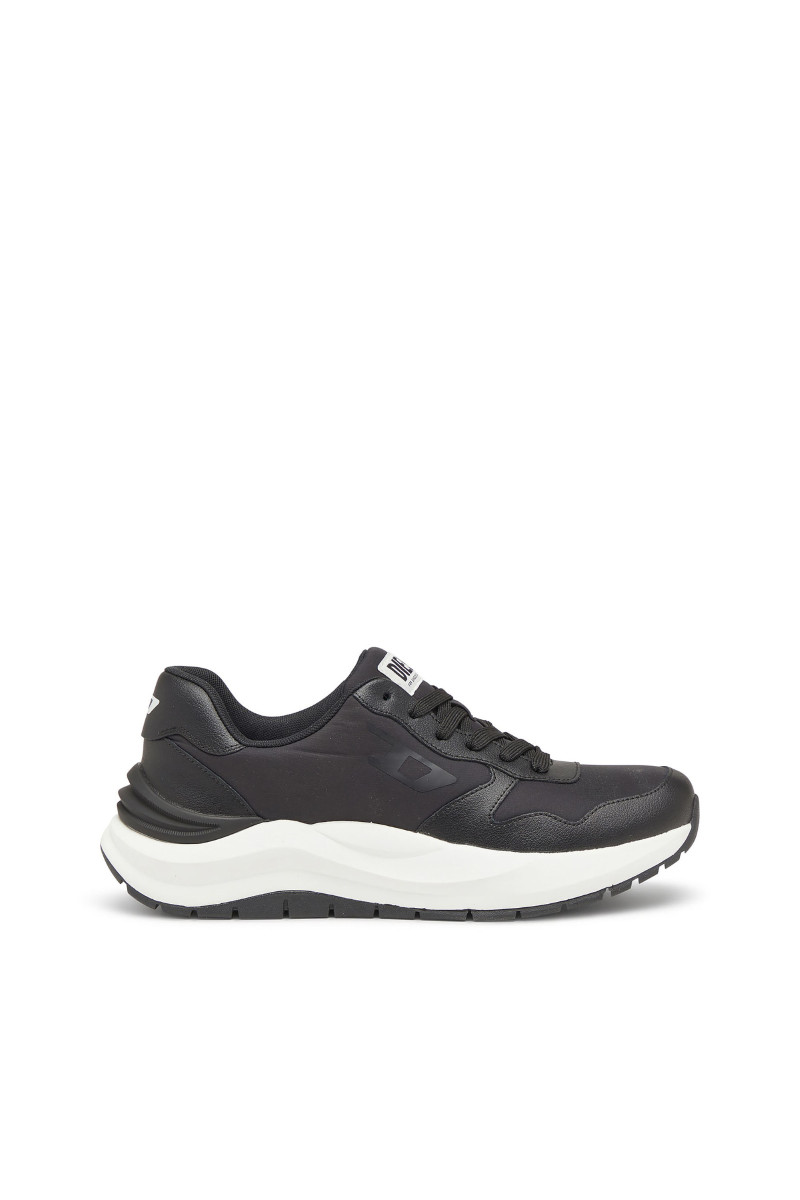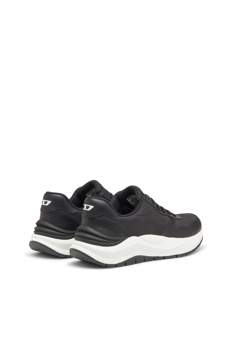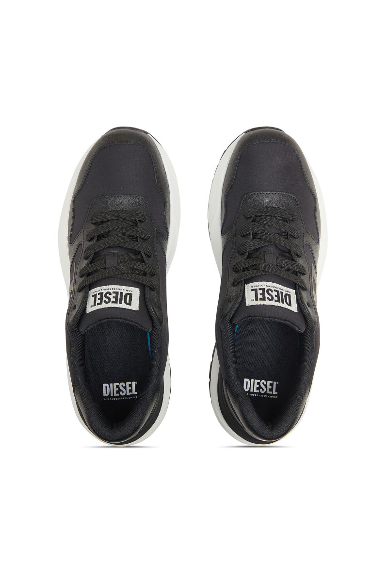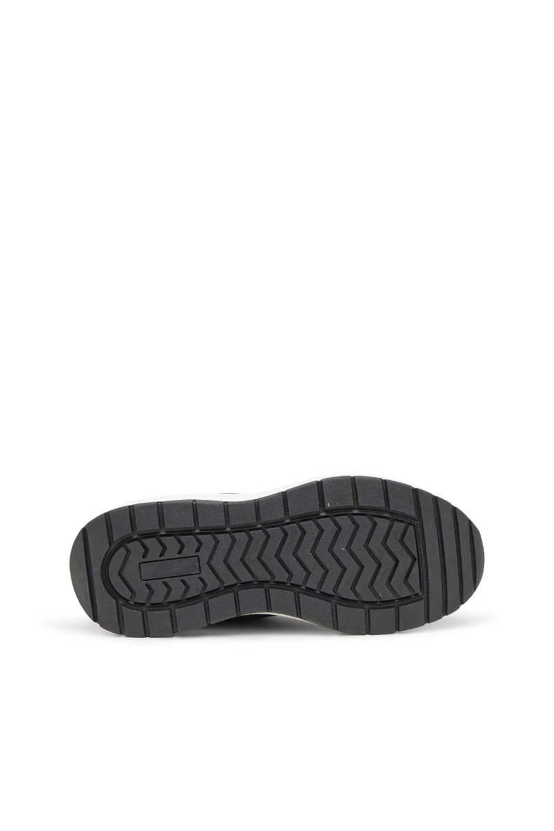 Férfi tornacipő. Megtestesítik a modern elegancia és a városi dinamika esszenciáját. A klasszikus alacsony sziluett, a harmonikusan kerekített orr és a robosztus, formázott talp kiemelik a sportos jellegét, miközben a sofisztikáltságot is sugallják. Ez a modell kontrasztos dizájnjával hívja fel magára a figyelmet – fehér talp fekete felsőrésszel és tonális grafikus logóval a "D" betűből, ami azonnal magára vonja a tekintetet. A felsőrész prémium bőrből és szövetből készült, ami tartósságot, légáteresztő képességet és kényelmet biztosít. A paneles varrások, a nagy DIESEL logó a nyelvén és a gondosan kidolgozott sarok hozzájárulnak a dizájn egyediségéhez. A vastag, tartós gumitalp kényelmet nyújt viselése során.