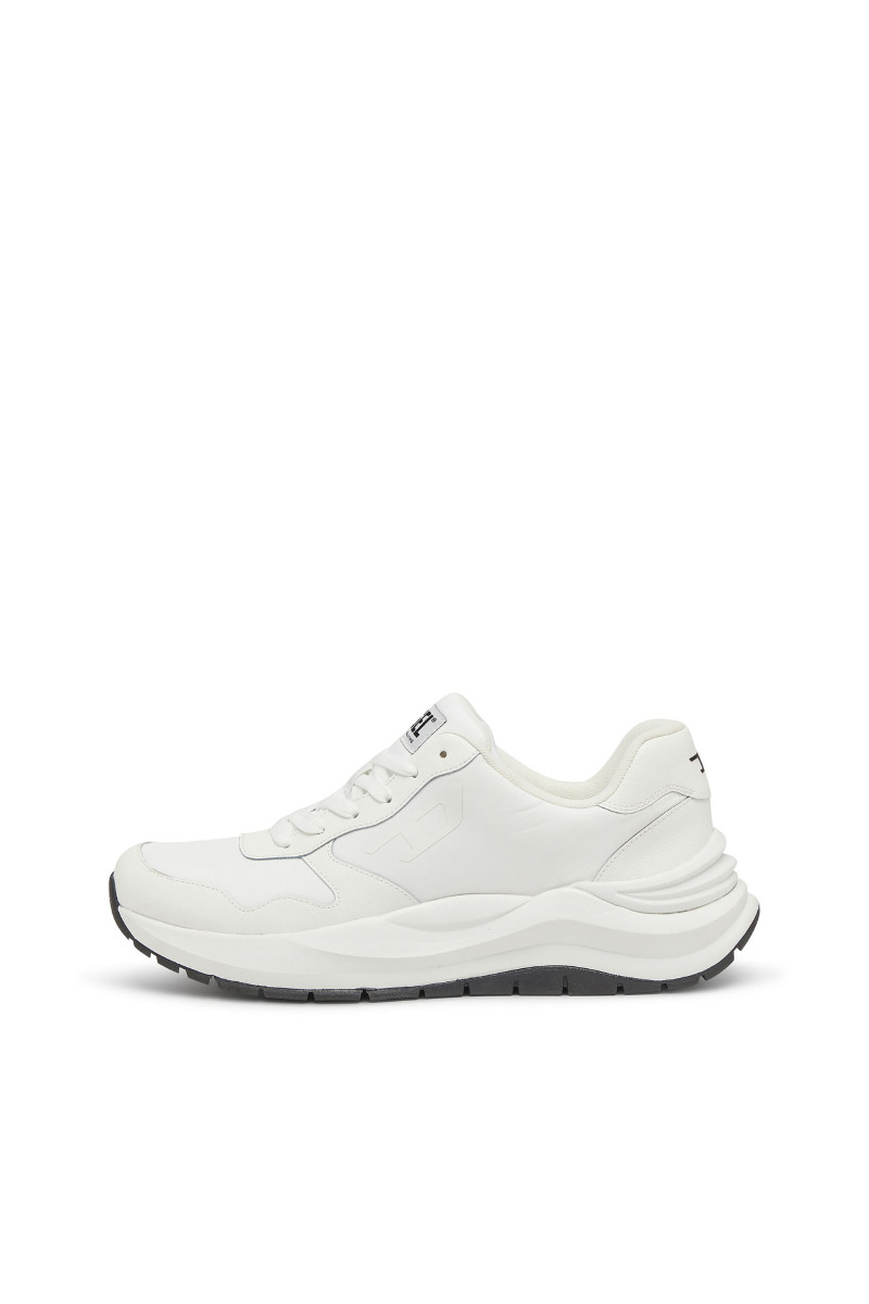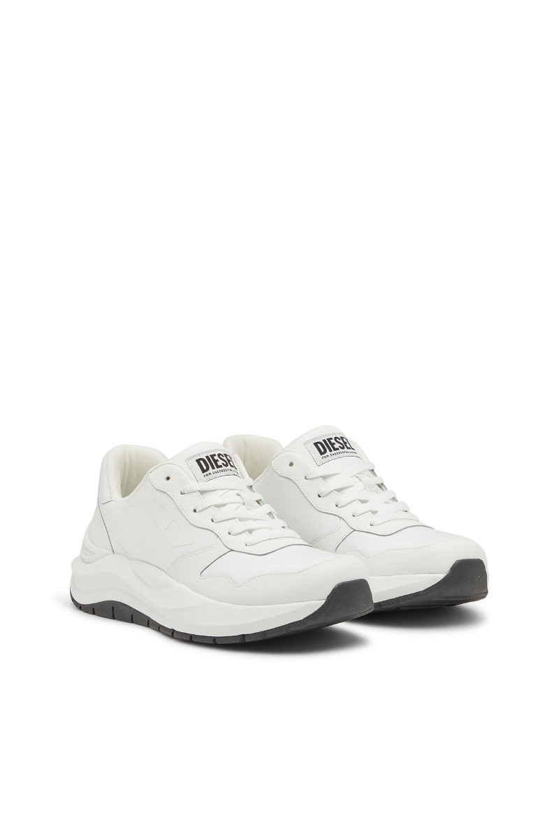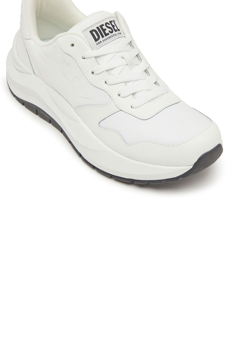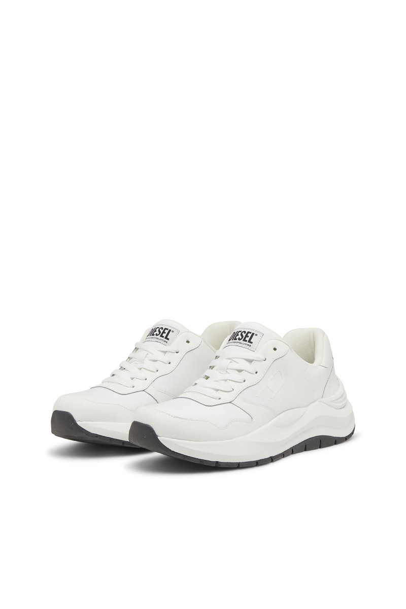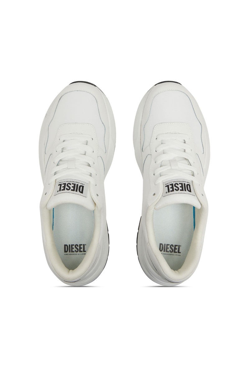Férfi tornacipő. Megtestesítik a modern elegancia és a városi dinamika esszenciáját. A klasszikus alacsony sziluett, a harmonikusan kerekített orr és a robosztus, formázott talp kiemelik a sportos jellegét, miközben a sofisztikáltságot is sugallják. Ez a modell kontrasztos dizájnjával hívja fel magára a figyelmet – fehér talp fekete felsőrésszel és tonális grafikus logóval a "D" betűből, ami azonnal magára vonja a tekintetet. A felsőrész prémium bőrből és szövetből készült, ami tartósságot, légáteresztő képességet és kényelmet biztosít. A paneles varrások, a nagy DIESEL logó a nyelvén és a gondosan kidolgozott sarok hozzájárulnak a dizájn egyediségéhez. A vastag, tartós gumitalp kényelmet nyújt viselése során.