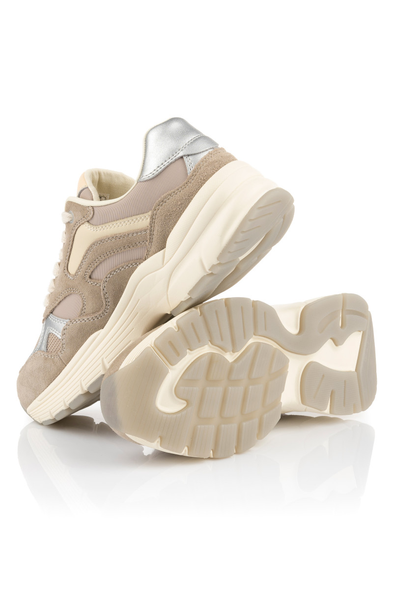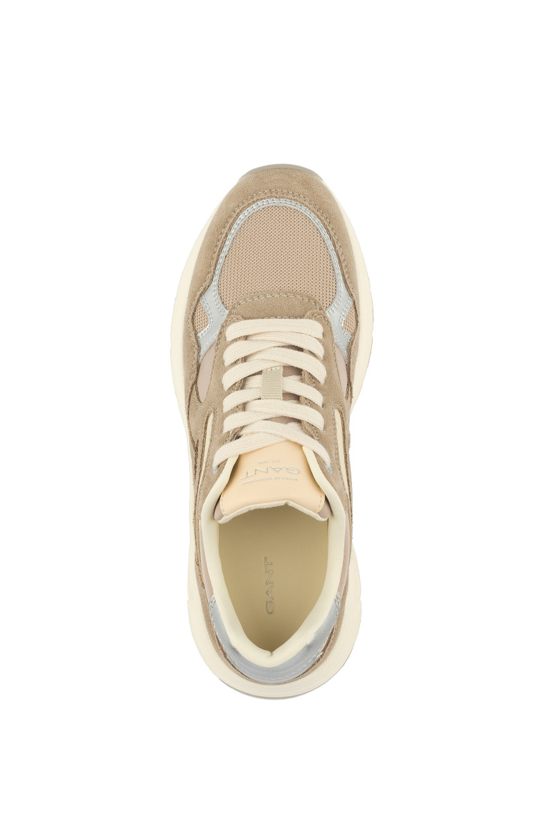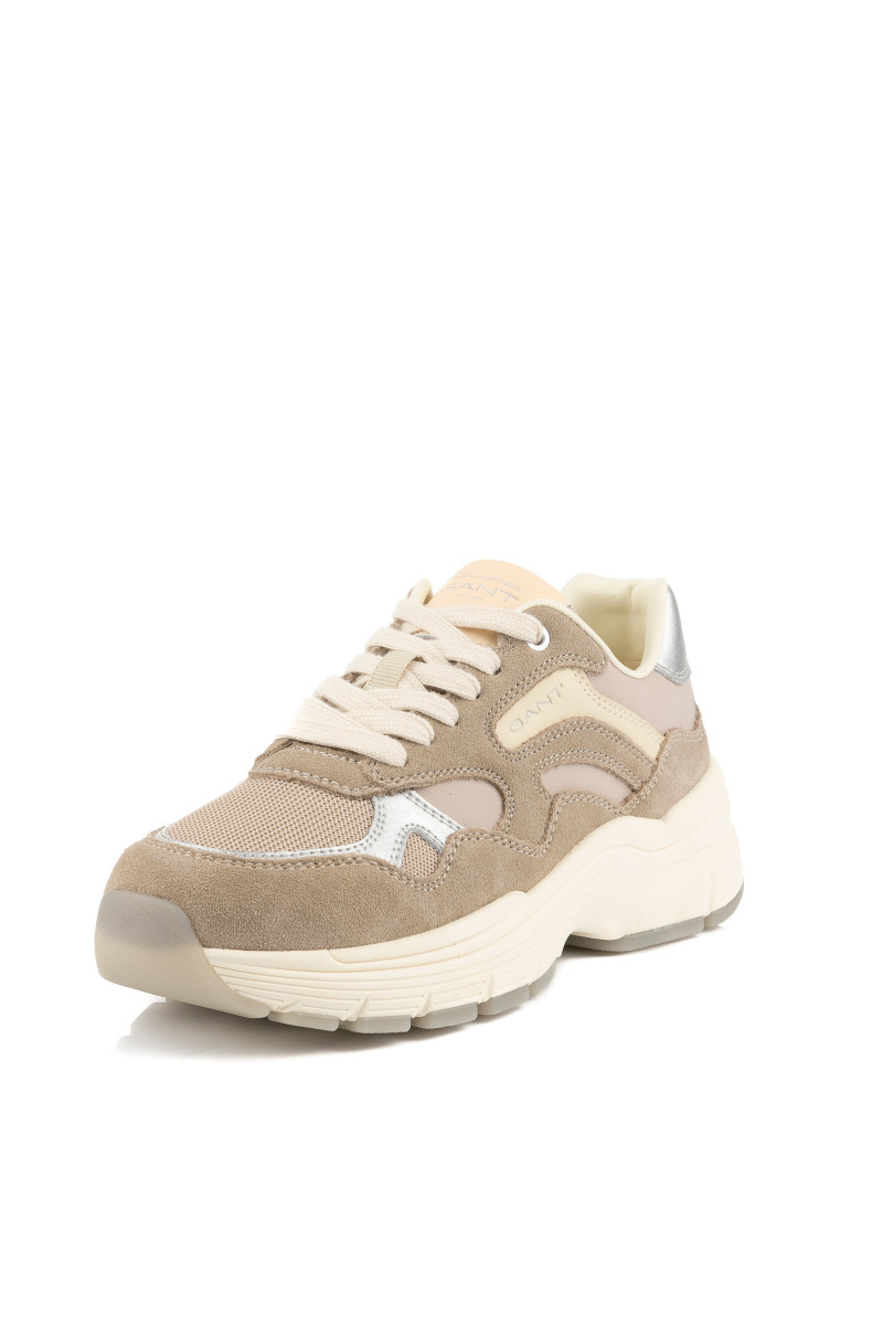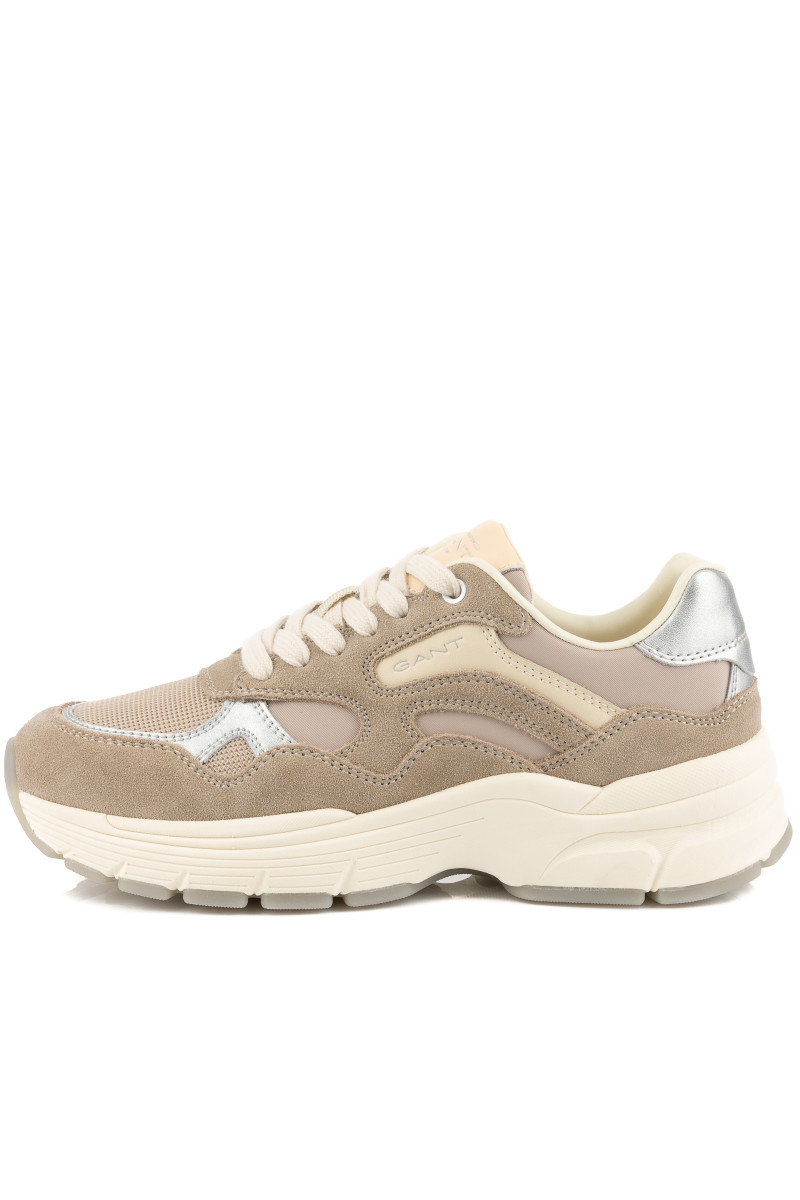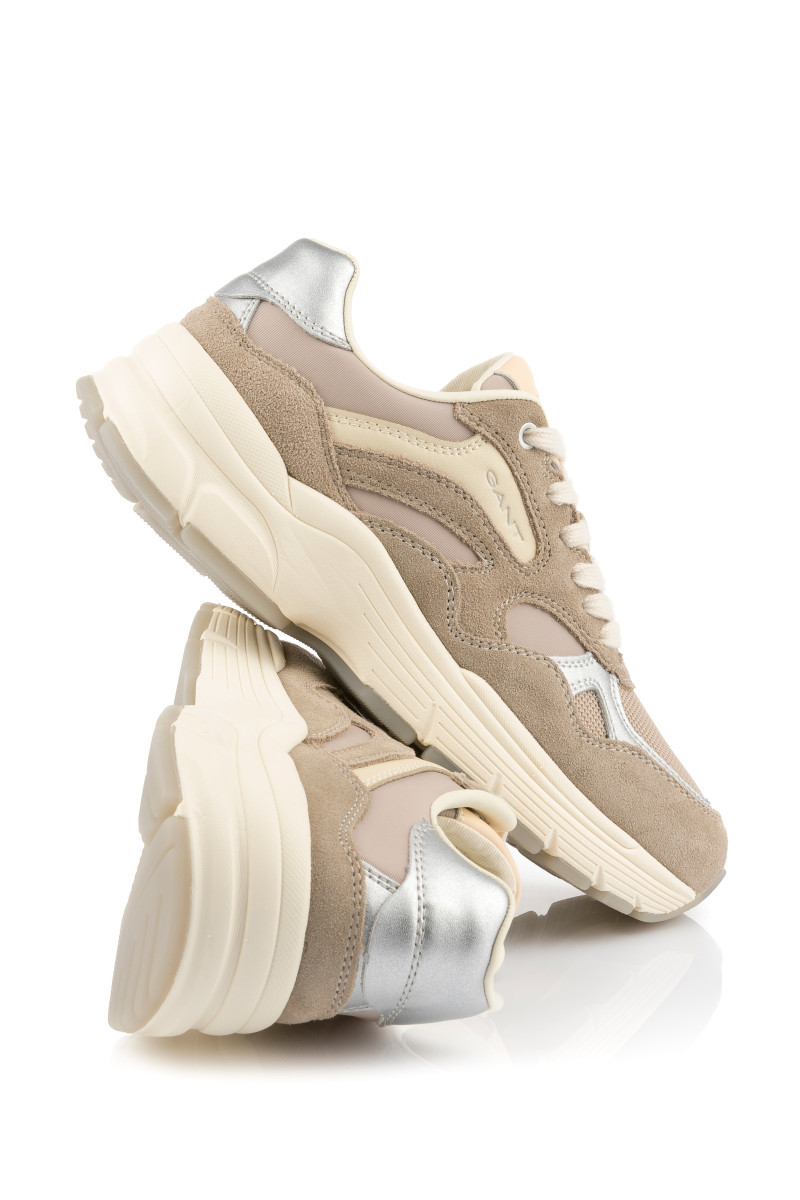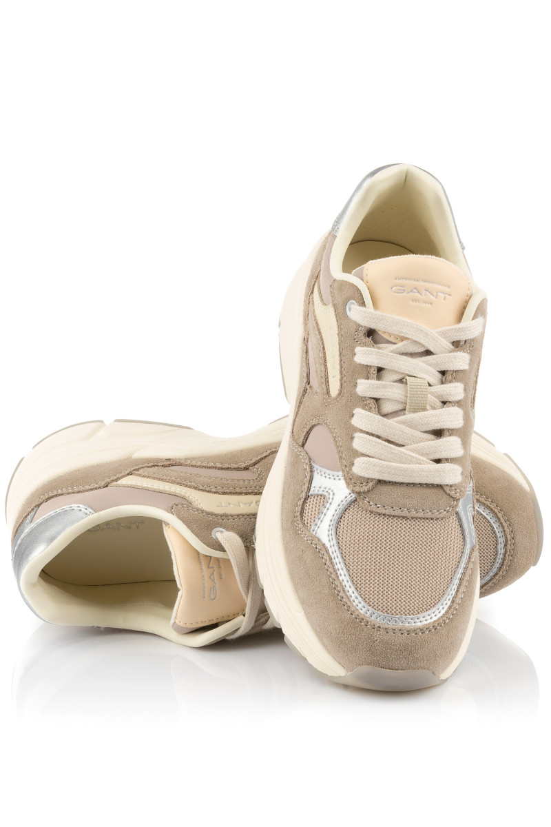 Női tornacipő, amely kombinált felületű. Eredeti részleteivel és maximális viselési kényelmével lenyűgöz majd. A velúrból és hálós szövetből készült, tonális panelekkel ellátott darabot sima bőrből készült ezüst színű részletek egészítik ki. Könnyed szintetikus anyagból készült, magasabb strukturált talppal. A külső oldalon egy decens GANT logó található. A pamutból készült belső tér bőr talpbetéttel van ellátva. Rendkívül stílusos lábbeli, amely lezser öltözékének központi elemévé válik.