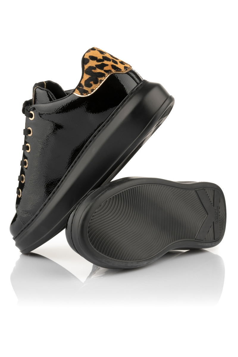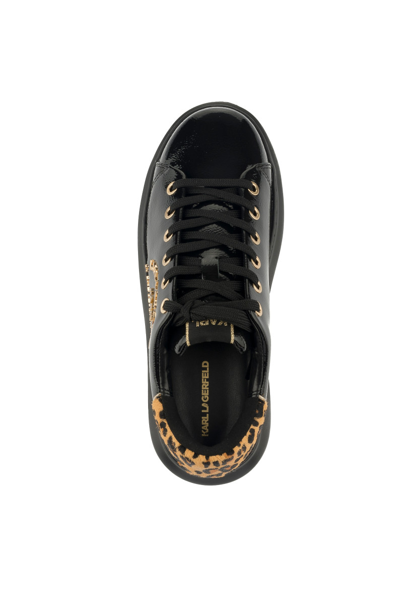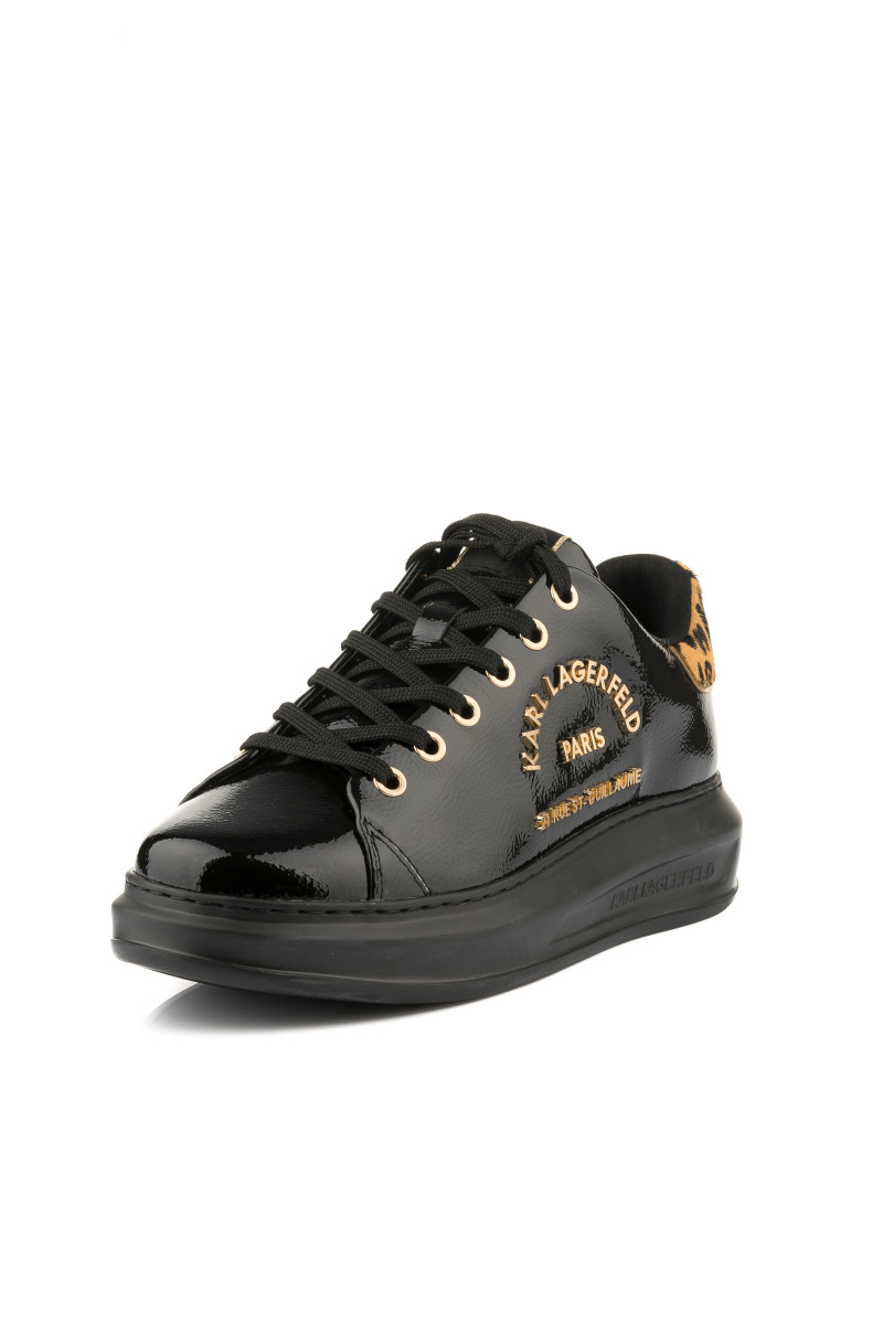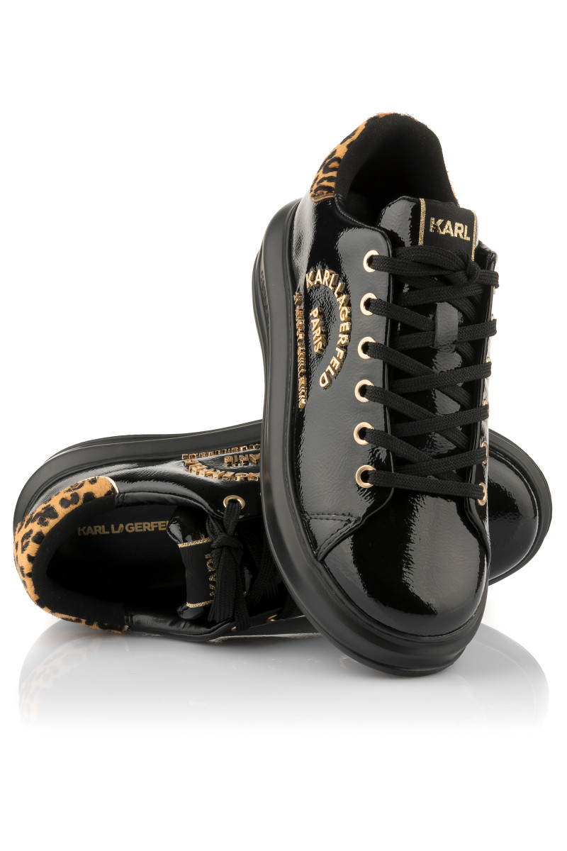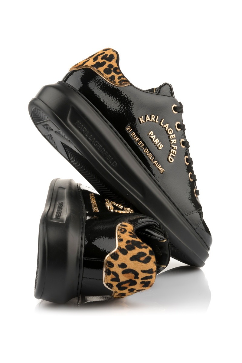 Alacsony edzőcipő, amely prémium minőségű, lakkozott marhabőrből készült és a Rue St-Guillaume fémes logója díszíti az oldalán. Sportos, ugyanakkor elegáns megjelenésű darab, amely fűzős kialakítású és a nyelven KARL logó teszi különlegessé. Kontrasztos, leopárdminta inspirálta részlettel a saroknál. A könnyű és rugalmas, szintetikus anyagból készült magasabb talprészt a márka felirata díszíti. Stílusos lábbeli, amely öltözékének fénypontjává válik.