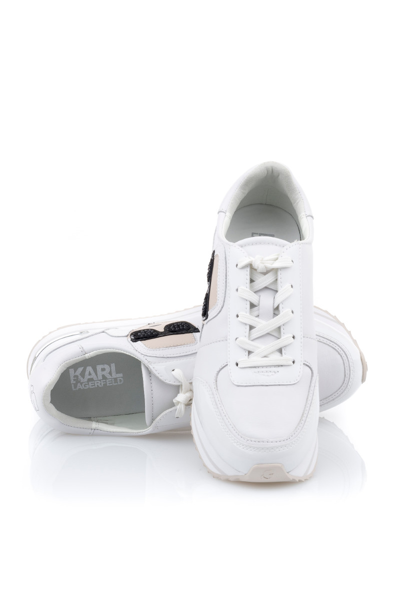 Ennek a modern teniszcipőnek az oldalán maga Karl néz önre a drágakő utánzatokkal kirakott napszemüvegén keresztül. A dizájnt a fényes márkajeles sarok és a magasított középtalp emeli ki.