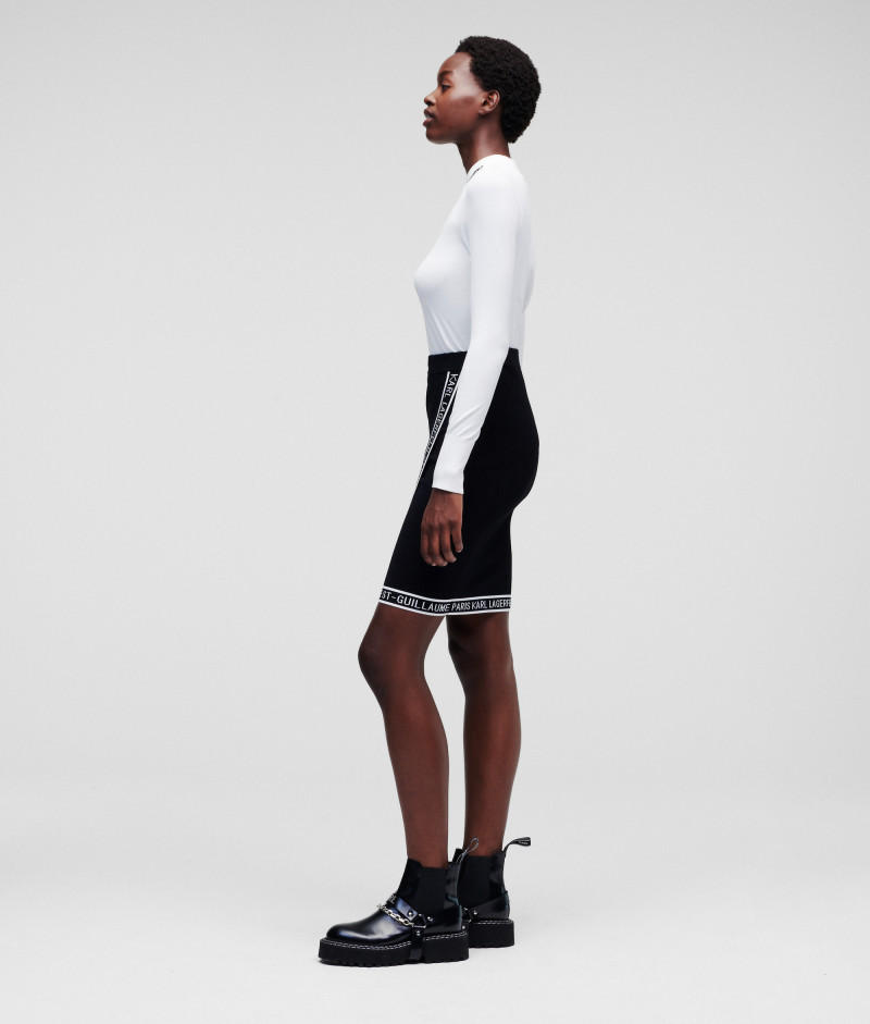 A puha, sztreccs kötött anyagból készült ceruzaszoknya alakformáló sziluettet kínál, míg a feltűnő KARL logós szalag a felsőrészen és a szegélyen utcai stílusúvá teszi.