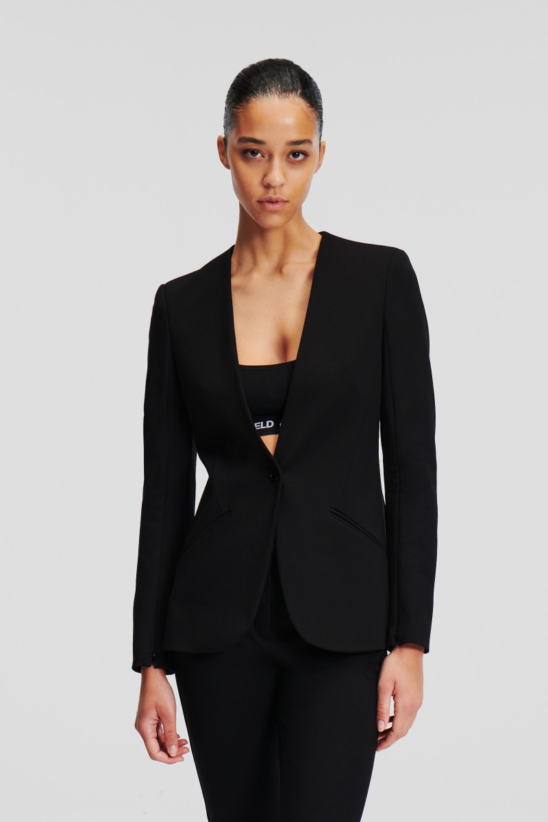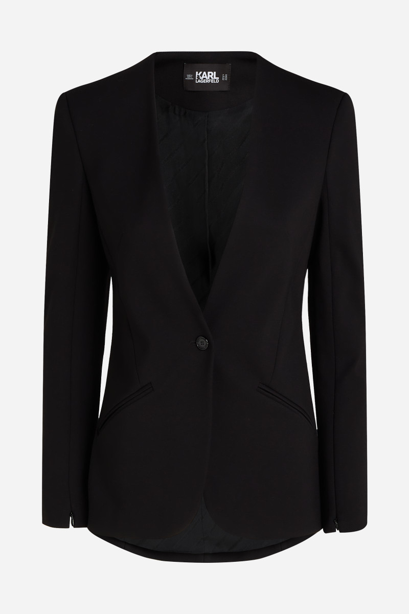 Modern szabású és elegáns dizájnú, gallér nélküli zakó, amely magabiztosságot sugároz. Strukturált vállai és cipzáras ujjai drámai sziluettet hoznak létre, amely az ikonikus KARL stílusra jellemző. Az egysoros zakó elegáns, egygombos záródással van ellátva. Ferde zsebekkel, amelyek nemcsak praktikusak, hanem elegánsak is. Egy remekül kombinálható darab, amely stílusosan kiegészíti majd öltözékét.